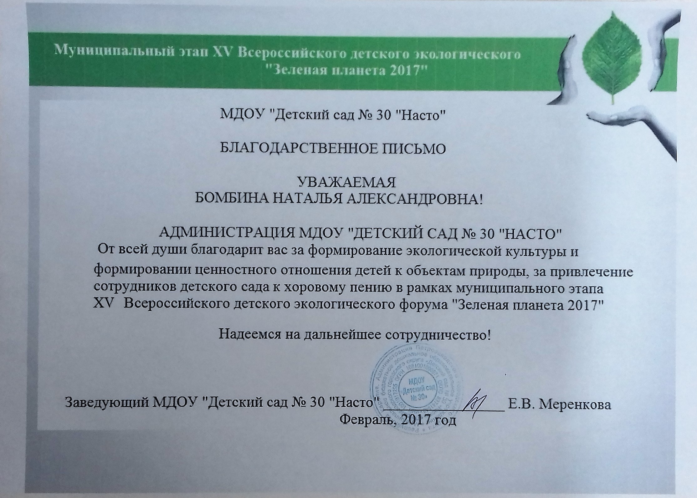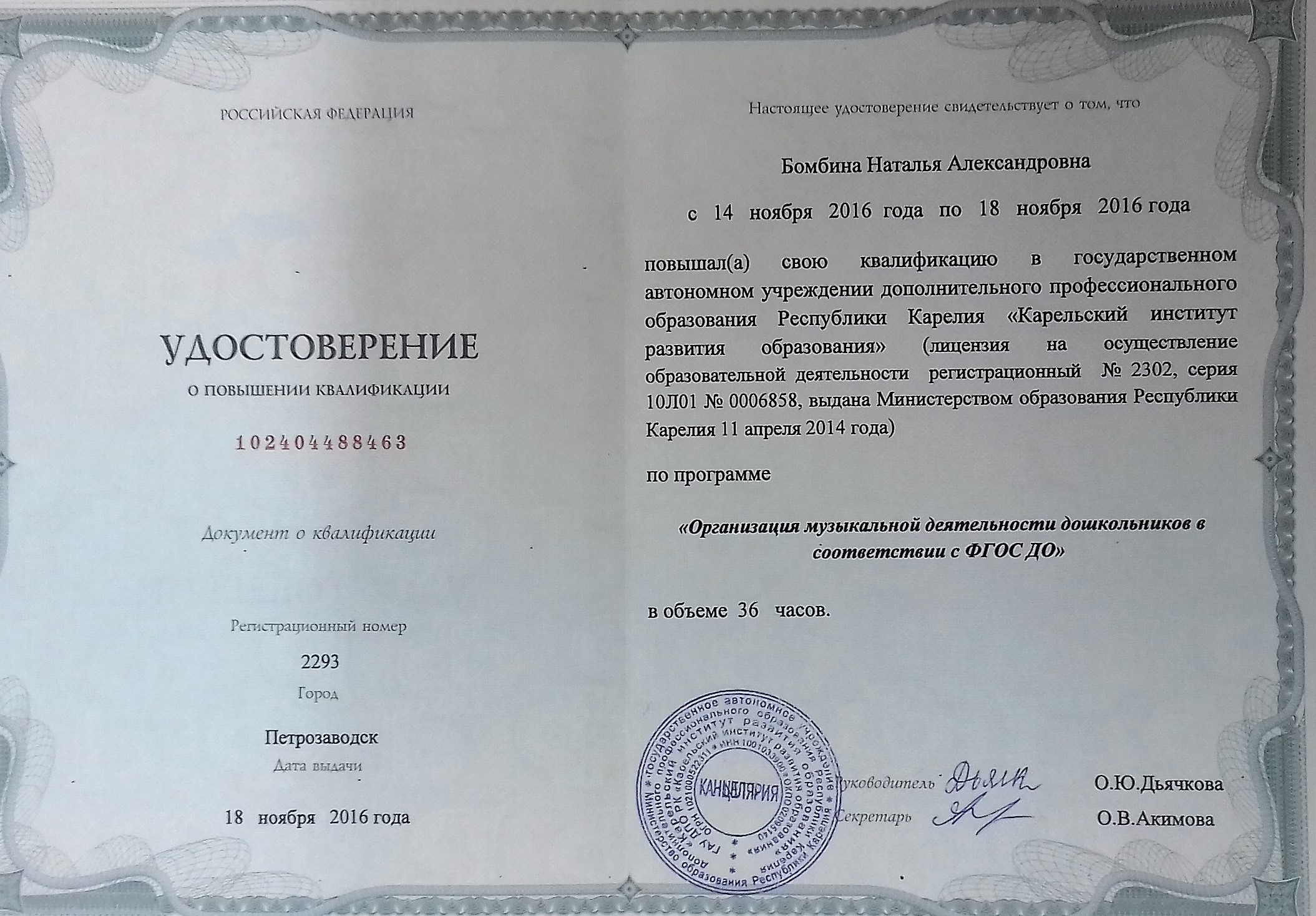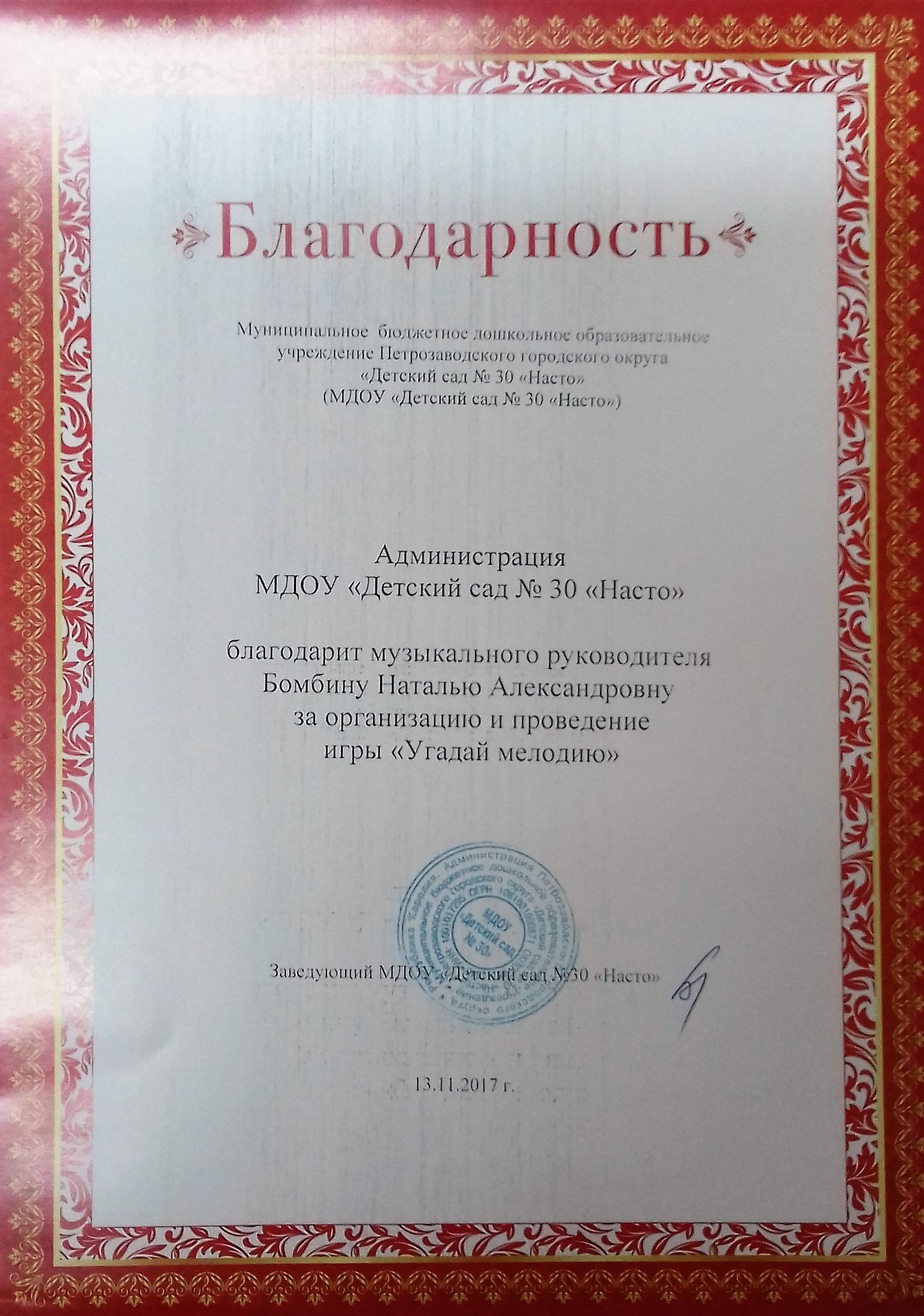 Бомбина Наталья Александровна – музыкальный руководитель муниципального бюджетного дошкольного образовательного учреждения Петрозаводского городского округа «Детский сад № 30 «Насто» (МДОУ «Детский сад № 30 «Насто»).