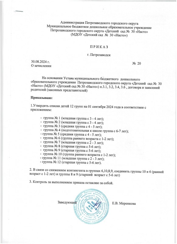 Уважаемые родители (законные представители) на основании Приказа заведующего воспитанники детского сада зачислены в группы согласно выданным направлениям, заявлениям родителей (законных представителей) и договора.