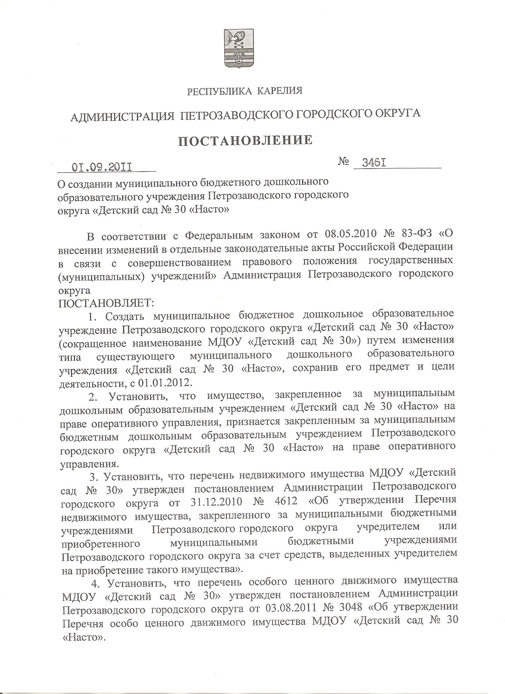 Постановление 3461 о создании МДОУ Детский сад 30 2с